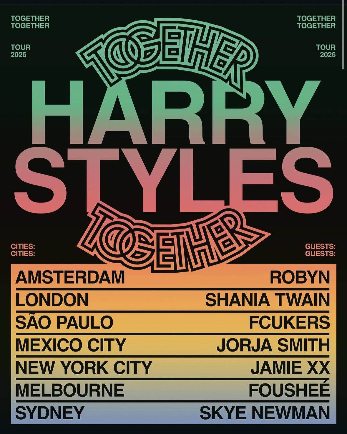 Die Tour führt Styles unter anderem nach Amsterdam, London, São Paulo, Mexico City, New York, Melbourne und Sydney. Auffällig: In jeder Stadt wird er von einem anderen internationalen Act begleitet, darunter absolute Szenegrößen wie Robyn, Shania Twain, Jorja Smith, Jamie xx, Fousheé, FCUKERS und Skye Newman.