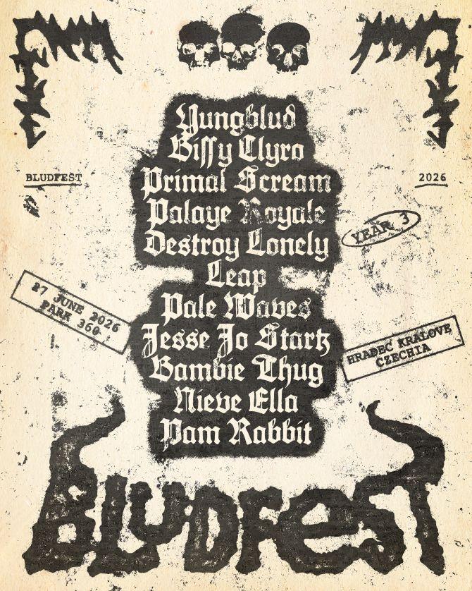 Yungblud kündigt Year 3 seines lang erwarteten und selbst kuratierten Festivals BLUDFEST für den 27. Juni 2026 in Hradec Králové, Tschechien, an. Mit dabei: YUNGBLUD, Biffy Clyro, Primal Scream, Palaye Royale, Destroy Lonely, Leap, Pale Waves, Jesse Jo Stark, Bambie Thug, Nieve Ella, Pam Rabbit