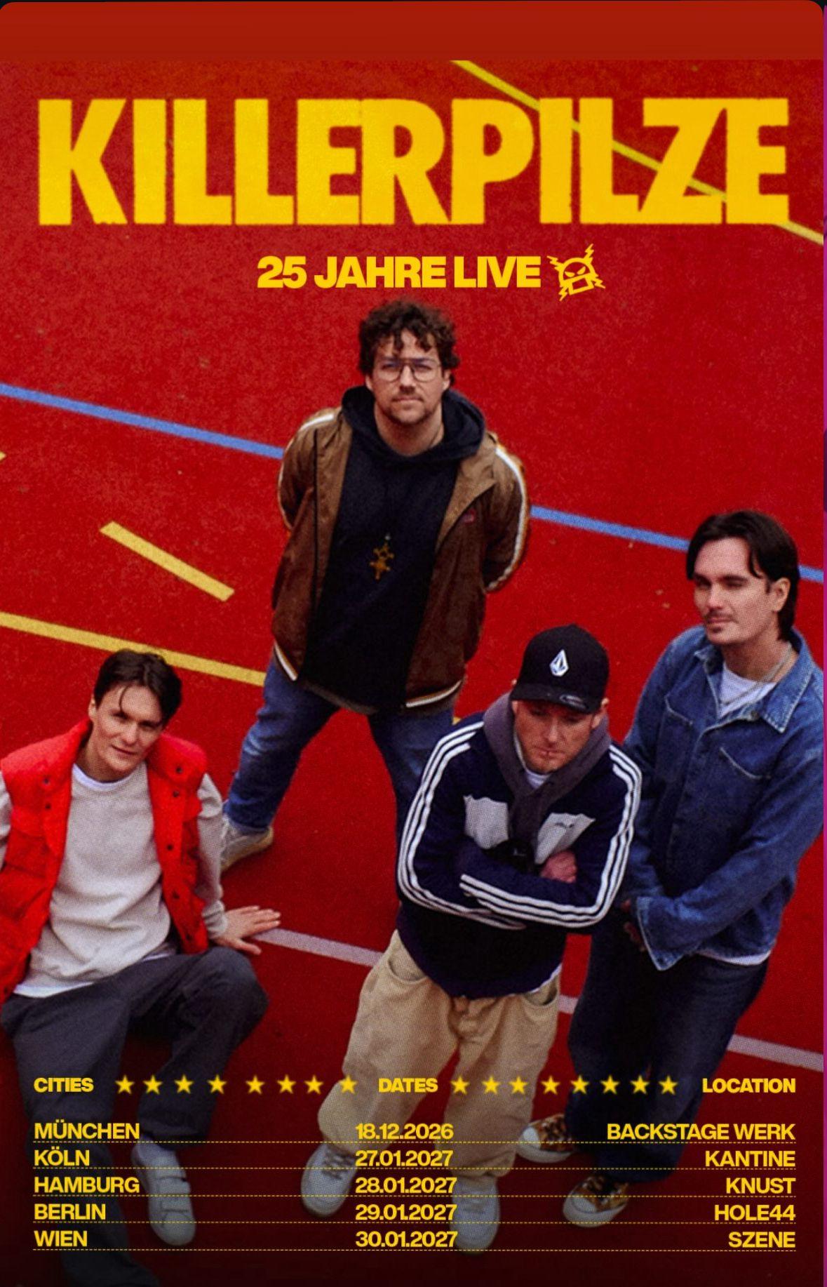 Nun folgt die nächste Stufe: Unter dem Banner „25 Jahre Killerpilze“ geht die Band im Januar 2027 auf Tour und macht dabei in mehreren Städten Halt. Geplant sind Shows in Köln (27.01., Kantine), Hamburg (28.01., Knust), Berlin (29.01., Hole44) sowie Wien (30.01., Szene).
