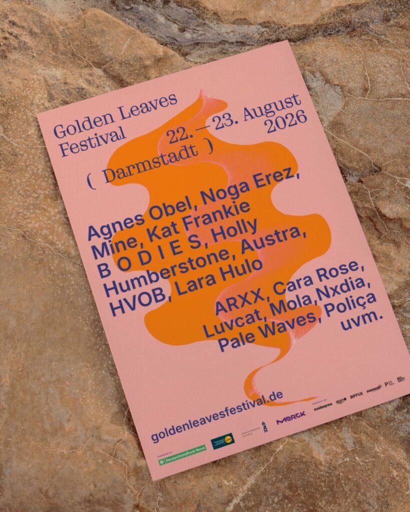 Es wird dieses Jahr geklotzt und nicht gekleckert beim Golden Leaves Festival Line-Up für den 22. und 23. August am Steinbrücker Teich in Darmstadt! Schon die erste Headliner-Band-Welle hatte es bekanntlich mehr als nur in sich – wir rekapitulieren: Agnes Obel, Noga Erez, Kat Frankie B O D I E S, Holly Humberstone, Austra, HVOB und Lara Hulo stehen dieses Jahr bei uns ganz oben auf dem Poster. Aber auch unterhalb der Headliner-Garde wird es hoch spannend, denn auch hier leben wir das viel zitierte Motto: jeder unserer Acts ist ein handverlesener Act der Herzen! Drum freut euch auf die 7 neuen Hochkaräter der 2. Bandwelle: